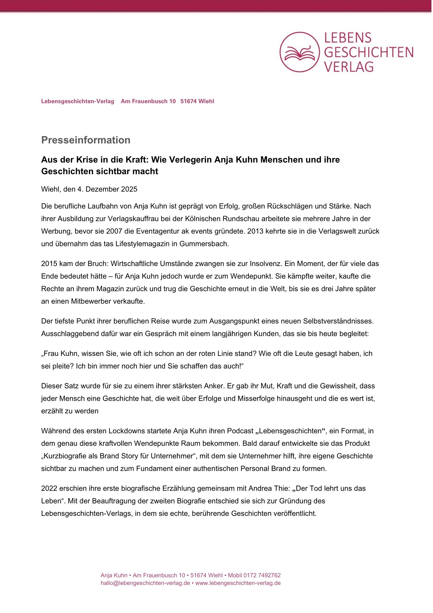 Der Lebensgeschichten Verlag wurde im Mai 2025 von der Biografin Anja Kuhn gegründet. In den Lebensgeschichten, die wir veröffentlichen, geht es nicht um perfekte Lebensläufe. Unsere Bücher erzählen von echten Menschen, echten Krisen, echten Wendepunkten. Sie zeigen Lösungen, die im Leben selbst entstanden sind.